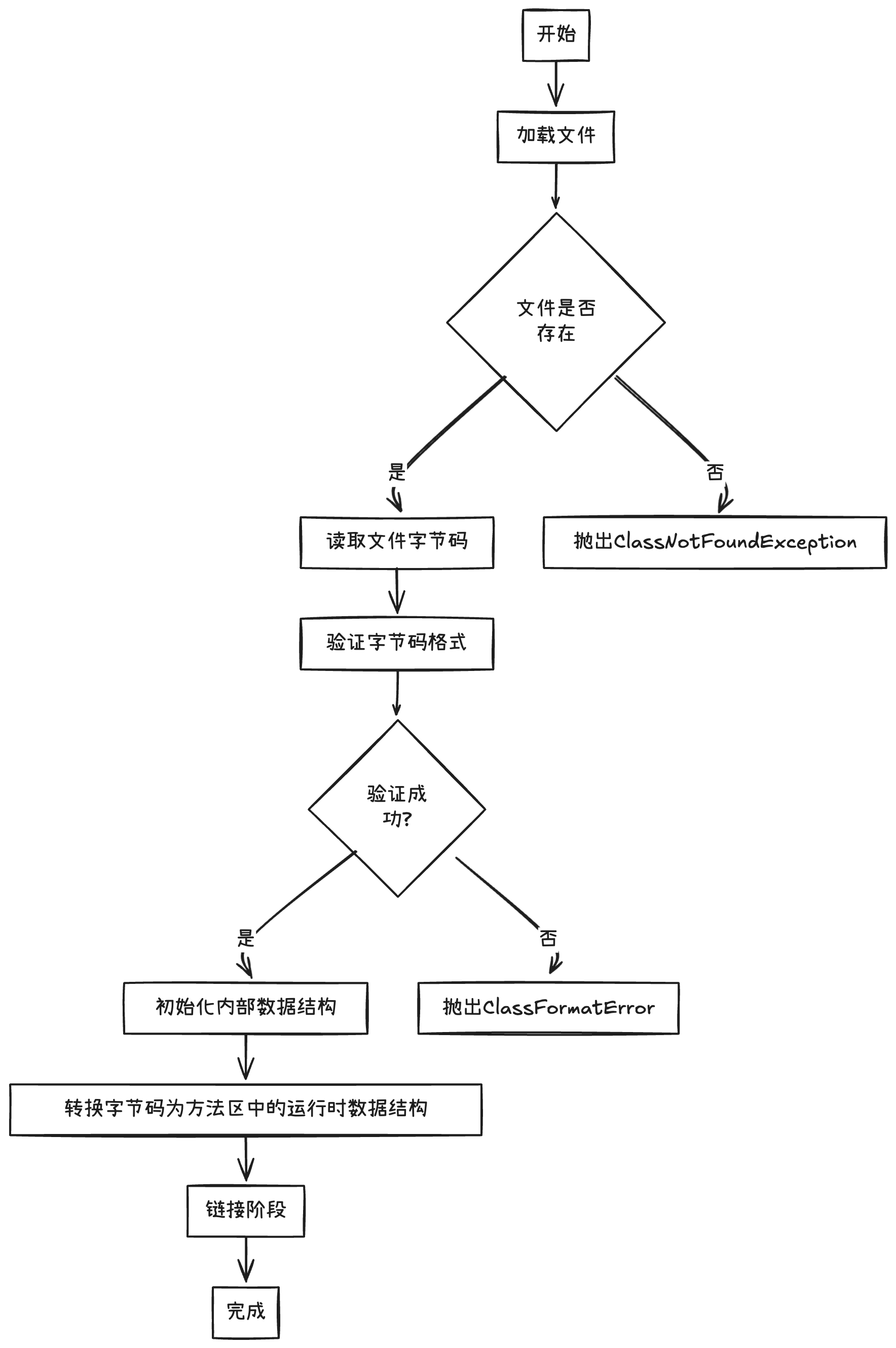 Class文件进过加载阶段之后已经在我们的内存中了。这时候进入我们类加载器子系统流程的第二部,链接阶段,该阶段包含了3个小阶段:验证(Verification)、准备(Preparation)、解析(Resolution)。